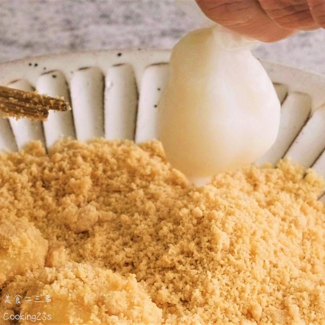 這裡用的花生要打細一點,並且搭配較細的糖粉混合均勻,這樣糍粑才能沾到較多的花生,吃起來才對味。